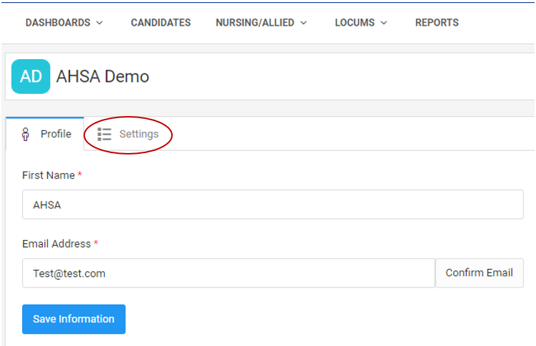 Once you click on "My Profile" the profile page will be brought up. Click on the "Settings" tab to the right of the "Profile" tab to bring up the settings page.